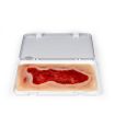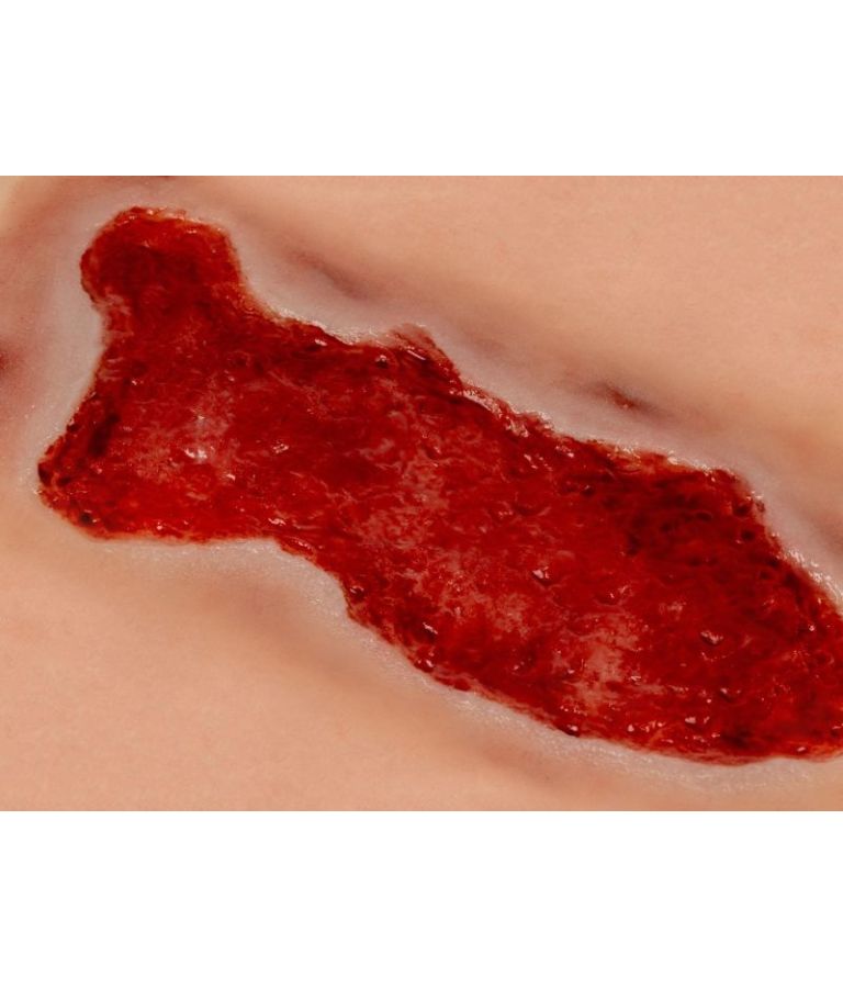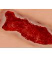 Cette plaie auto-adhésive représente un ulcère veineux de jambe, une lésion tissulaire de la jambe consécutive à une insuffisance veineuse chronique. La phase de granulation illustrée correspond à la forme la plus courante d'ulcère (60 à 80 % des cas) et correspond à la formation du tissu de granulation. À ce stade, il est essentiel d'utiliser un pansement adapté afin de prévenir les troubles de cicatrisation (persistance de la fibrine). Cette grande plaie est idéale pour une application sur la jambe et adhère spontanément. Pour une utilisation prolongée, elle peut être fixée à l'aide d'une colle cutanée spéciale. Tous les matériaux utilisés dans ce produit sont dermatologiquement inoffensifs.